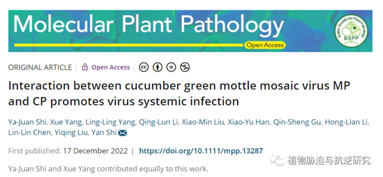 李洪连教授带领的“粮食作物重大病虫害监测与防控创新团队”在揭示黄瓜绿斑驳花叶病毒(cucumber green mottle mosaic virus, CGMMV)侵染机制方面取得重要突破。该团队施艳教授在国际学术期刊Molecular Plant Pathology在线发表了题为“Interaction between cucumber green mottle mosaic virus MP and CP promotes virus systemic infection”的研究论文。该研究以我国检疫性病毒 黄瓜绿斑驳花叶病毒为主要研究对象,揭示黄瓜绿斑驳花叶病毒MP和CP相互作用从而促进病毒系统感染过程。