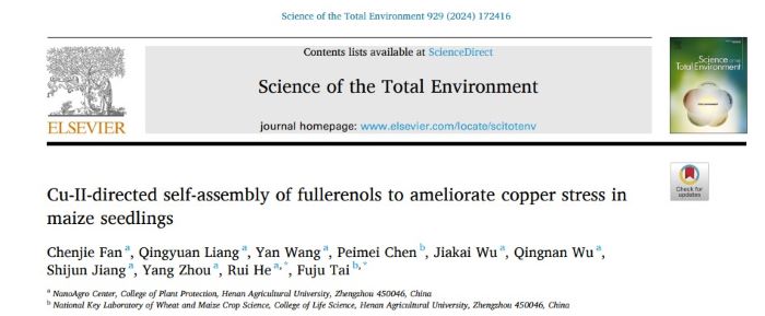 植物病害生态防控科技创新团队在读硕士生凡趁杰作为第一作者在国际知名期刊Science of the Total Environment(中国科学院一区,IF:9.8)正式发表题为“Cu-II-directed self-assembly of fullerenols to ameliorate copper stress in maize seedlings”的研究论文(2024, 929:172416)。该研究解析了Cu2+诱导水溶性零维碳纳米酶(富勒醇)自组装体缓解铜胁迫下玉米种子萌发和幼苗生长的解毒诱抗机制。