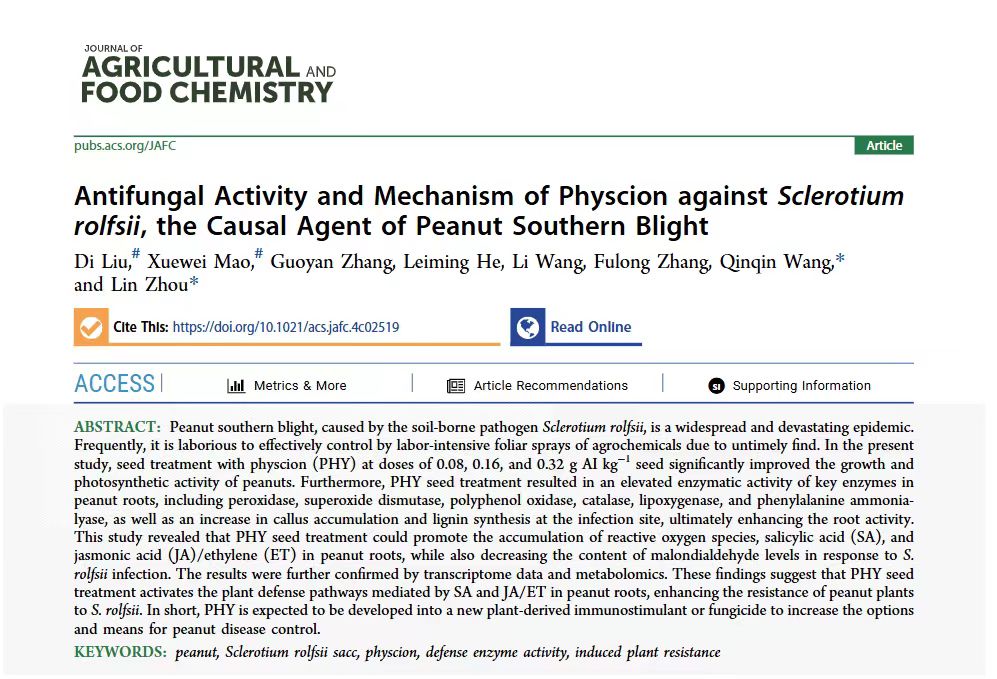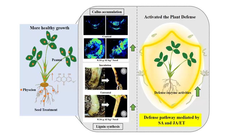 大黄素甲醚(Physcion, PHY)是一种属蒽醌类化合物,可从中药大黄、沙棘和虎杖等多种植物中分离得到,不仅具有广谱的医用价值,还具有良好的农药活性。在该研究中,作者首先明确了0.5%大黄素甲醚种子处理悬浮剂对花生的安全剂量范围。以0.08、0.16和0.32 g AI kg–1seed的PHY处理花生种子发现,其对花生幼苗生长和叶片光合作用能力均有显著促进作用。且PHY种子处理可提高了花生根中关键防御酶活性,包括过氧化物酶、超氧化物歧化酶、多酚氧化酶、过氧化氢酶、脂氧合酶和苯丙氨酸解氨酶,增加了侵染部位胼胝质积累和木质素合成,并增强了根系活力。此外,PHY种子处理可以促进活性氧(ROS)、水杨酸(SA)和茉莉酸(JA)/乙烯(ET)在花生根中的积累,同时降低丙二醛(MDA)含量,以应对S.rolfsii的侵染损害。