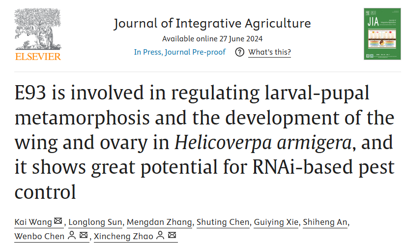 昆虫行为和化学感受实验室赵新成教授课题组在中国科学院一区TOP期刊《 Journal of Integrative Agriculture》杂志在线发表了题为“E93 is involved in regulating larval-pupal metamorphosis and the development of the wing and ovary in Helicoverpa armigera, and it shows great potential for RNAi-based pest control”的研究论文。揭示了E93参与调控棉铃虫的变态发育过程以及成虫翅和卵巢的发育,在基于RNAi的害虫防治方面展示出巨大潜力。