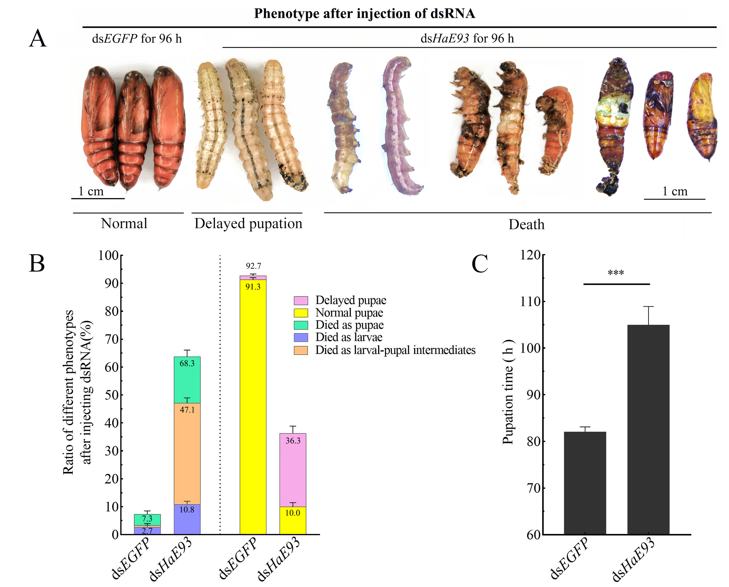棉铃虫是危害农作物最严重的害虫之一,尤其幼虫蛀食给农作物造成巨大的损失。目前,棉铃虫的防治主要是通过喷洒化学农药实现的,但由此带来不可忽视的环境污染、农药残留和害虫抗药性问题,高效且环保的绿色防控方式越来越受到人们的关注。本研究从蜕皮激素的初级应答因子E93入手,利用不同的RNAi方式干扰高龄幼虫E93基因,结果显示,在棉铃虫体内注射dsE93会导致棉铃虫化蛹失败,棉铃虫死亡率显著升高,约为60%,30%发育延迟的存活个体化蛹后表皮无法正常形成,羽化后翅和卵巢发育异常,同时相关基因的表达受到抑制。总之,干扰E93后,90%的个体无法繁殖后代。通过经口饲喂dsE93的生物测定显示了相似的结果,表明E93可作为RNAi防治棉铃虫的靶基因,尤其对化学农药难以防控的高龄幼虫具有重要的应用前景。