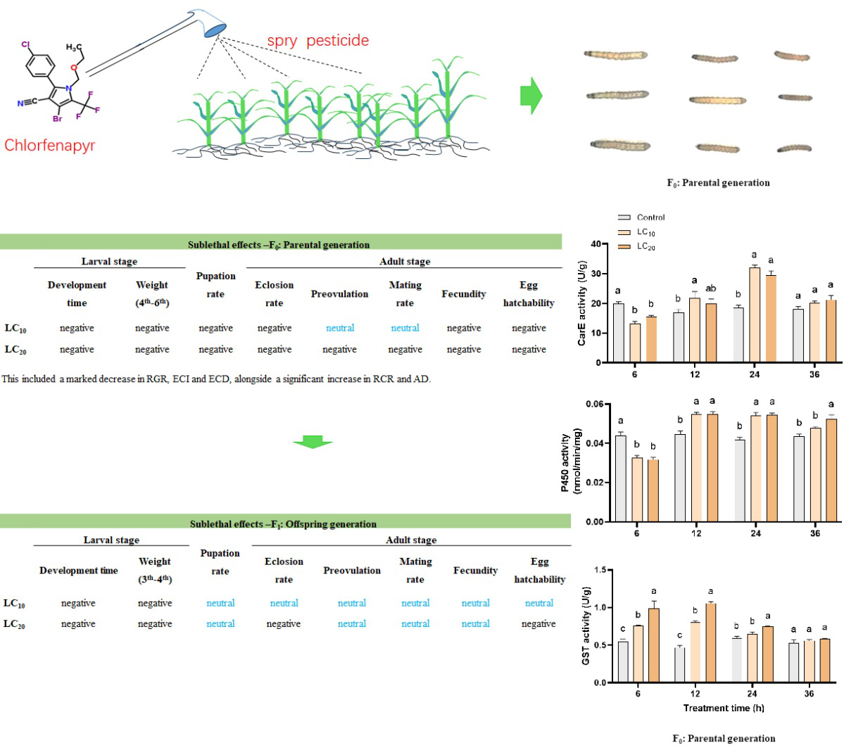 安世恒教授课题组在中国科学院一区TOP期刊《Entomologia Generalis》杂志在线发表了题为“Sublethal and Transgenerational Effects of Chlorfenapyr on Physiological and Developmental Traits in the Fall Armyworm, Spodoptera frugiperda”的研究论文。研究发现亚致死浓度虫螨腈不仅显著影响了草地贪夜蛾亲代的生长发育,而且对其后代具有明显不利的跨代影响。
