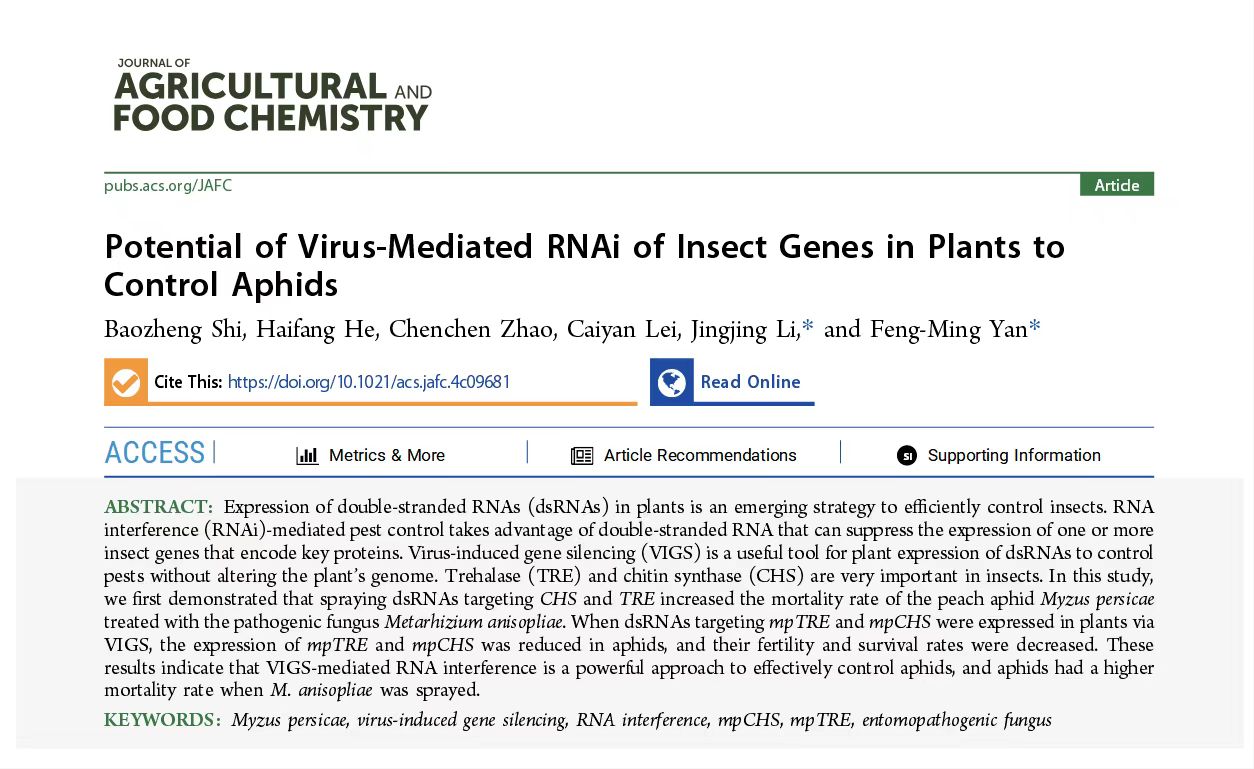 闫凤鸣教授团队在中科院一区Top期刊《Journal of Agricultural and Food Chemistry》杂志在线发表了题为“Potential of virus-mediated RNAi of insect genes in plants to control aphids”的研究论文。研究发现,利用体外合成的dsRNA及病毒诱导的基因沉默(Virus induced gene silencing, VIGS)在烟草体内表达dsRNA可以显著抑制烟蚜的基因表达以及繁殖能力,结合生防菌--金龟子绿僵菌(Metarhizium anisopliae)可以显著抑制蚜虫的生存能力。