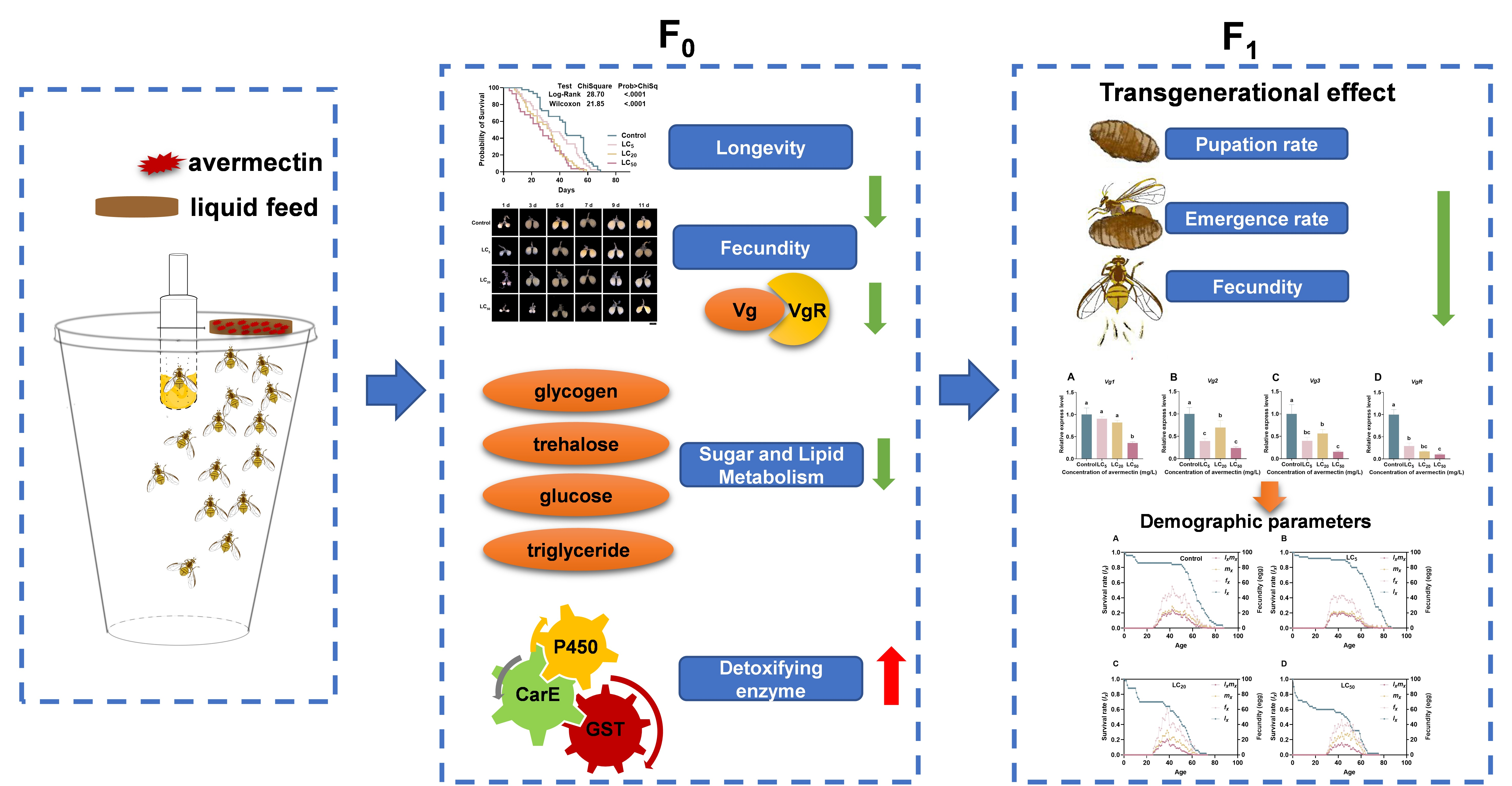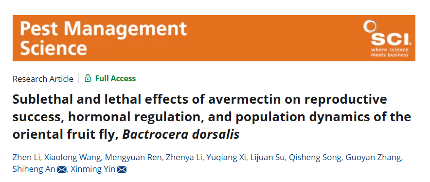 尹新明教授团队/安世恒教授课题组在昆虫学中国科学院一区TOP期刊《Pest Management Science》杂志在线发表了题为“Sublethal and lethal effects of avermectin on reproductive success, hormonal regulation, and population dynamics of the oriental fruit fly, Bactrocera dorsalis”的研究论文。该研究系统评估了阿维菌素对橘小实蝇在繁殖能力、激素调控、能量代谢、解毒酶活性及种群动态发生等多个方面的影响,旨在揭示其潜在的长期生态影响,并为橘小实蝇的可持续综合防控提供科学依据。