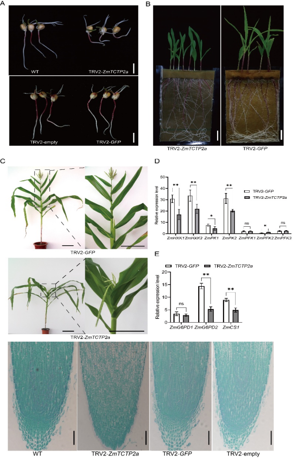 玉米是全球最重要的粮食作物之一,在我国农业生产中占据重要地位。短体线虫又称根腐线虫,是我国黄淮海地区玉米上分布最广危害最重的植物病原线虫。咖啡短体线虫(Pratylenchus coffeae)是致病力最强的根腐线虫之一,在我国严重危害玉米、小麦、大豆、山药等多种粮食作物和经济作物。目前,关于根腐线虫调控寄主抗病性促进侵染寄生的机制尚不明确。本研究以咖啡短体线虫为对象,发现细胞壁降解酶基因PcENG3在咖啡短体线虫寄生阶段显著上调,定位于该线虫的食道腺和生殖腺,PcENG3外源表达于植株后转基因玉米和拟南芥对该线虫的抗性显著下降,证实PcENG3是咖啡短体线虫重要的寄生相关基因。此外,PcENG3能够直接与玉米肿瘤翻译控制蛋白ZmTCTP2a互作,调控糖酵解途径ZmHXK1、ZmHXK2、ZmPK1、ZmPK2和ZmPFK2相关基因的表达,抑制玉米根系细胞增殖分化和生长发育,反向调控玉米对线虫的抗病能力,从而促进咖啡短体线虫的侵染寄生。该研究解析了咖啡短体线虫效应蛋白PcENG3靶向玉米ZmTCTP2a蛋白,通过“抗病抑制+组织重塑”双重策略促进线虫寄生的分子机制,为玉米抗根腐线虫基因的挖掘提供了新的科学依据。