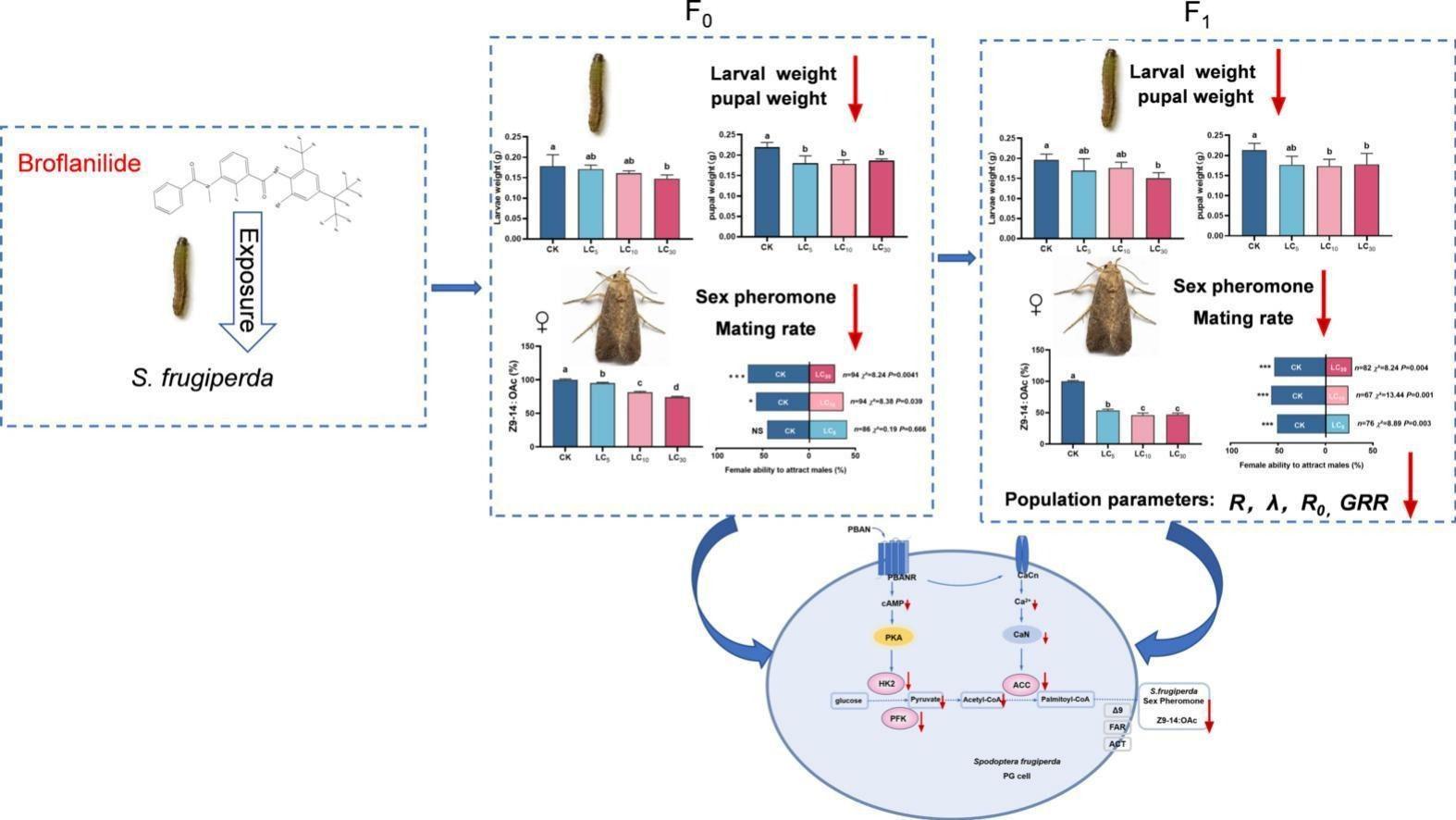 研究表明,溴虫氟苯双酰胺对草地贪夜蛾三龄幼虫施加亚致死和致死剂量后,明显抑制其生长,体重和羽化率显著降低。这种抑制不仅影响了幼虫的发育,还导致了成虫的卵孵化率下降。此外,溴虫氟苯双酰胺的暴露破坏了与性信息素合成相关的信号通路,减少了关键信号分子Ca²⁺和环磷酸腺苷(cAMP)的浓度,进而影响了性信息素腺内的丙酮酸和乙酰辅酶A的水平,这些都是性信息素合成的必要物质。更重要的是,溴虫氟苯双酰胺的暴露对F1代的生长繁殖也产生了不利影响,尤其是在高浓度(LC30)下显著降低了其内在增长率、有限增长率和净繁殖率。这些结果表明,溴虫氟苯双酰胺的暴露显著降低草地贪夜蛾种群的生存能力,提出了对害虫管理策略的深刻思考。