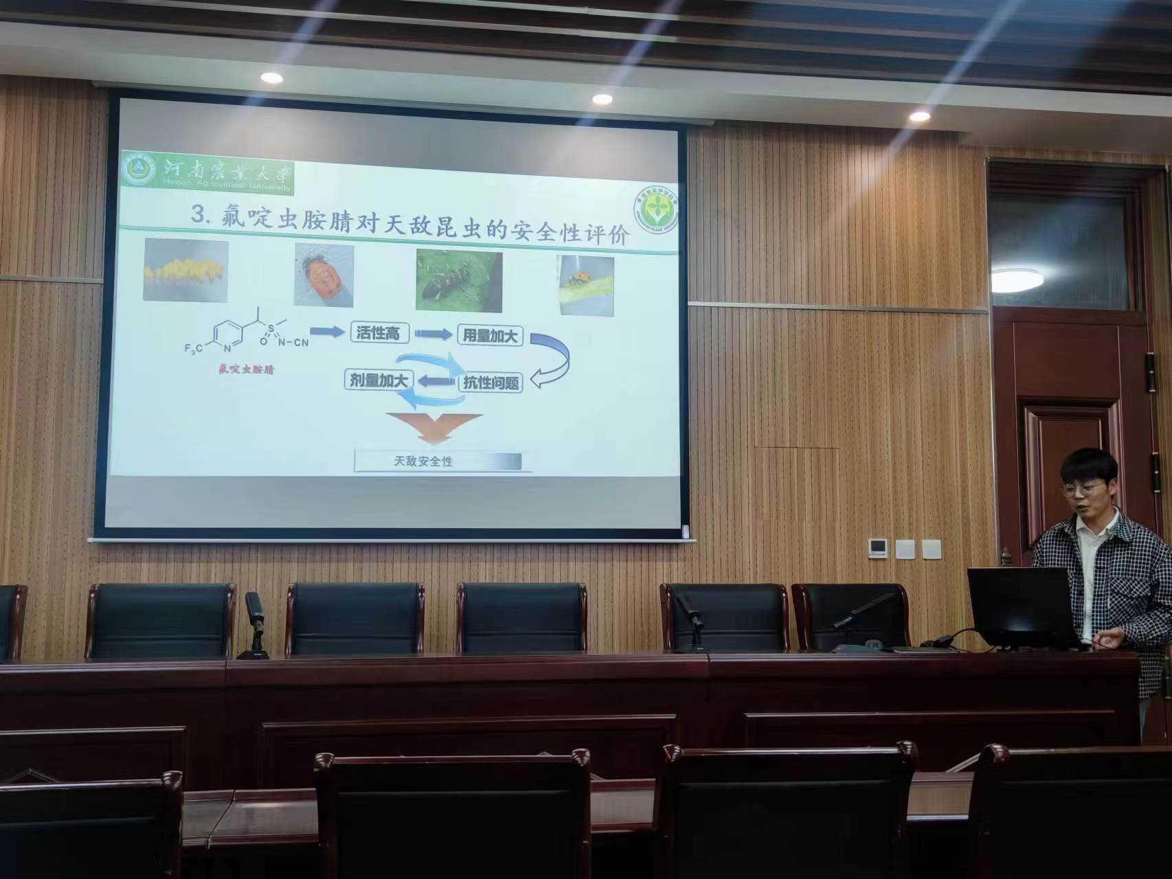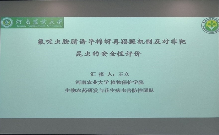 王立以“氟啶虫胺腈诱导棉蚜再猖獗机制及对非靶昆虫的安全性评价”为题,向大家详细阐述了解毒代谢酶介导的棉蚜对氟啶虫胺腈的抗性机制及氟啶虫胺腈诱导棉蚜增殖的潜在机制,从化学防治和生物防治协调作用角度研究了氟啶虫胺腈对七星瓢虫繁殖及捕食能力影响,评价了该药剂对天敌昆虫的安全性。