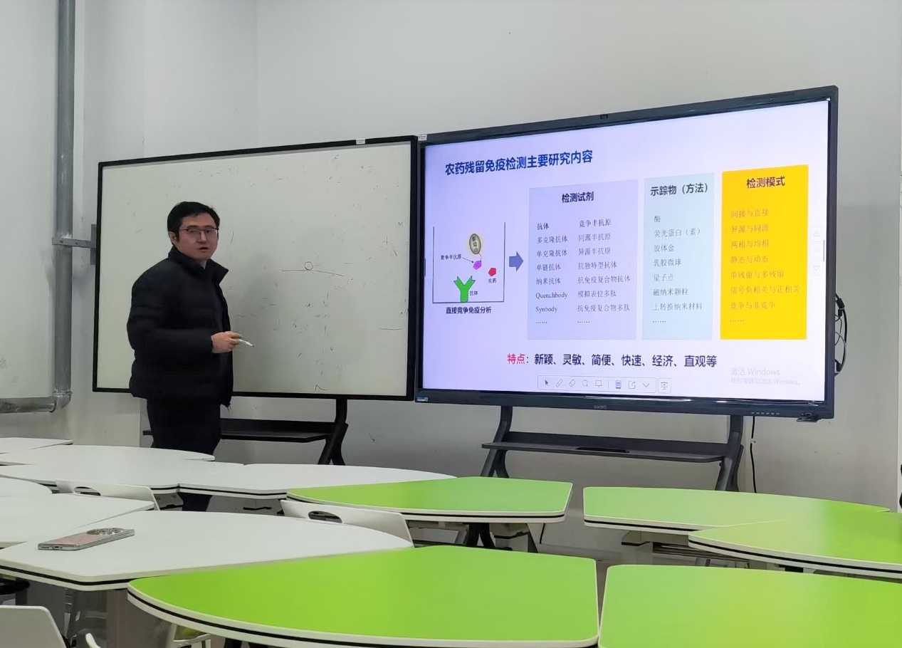 报告会上,华修德教授围绕农药残留免疫快速检测这一核心研究方向,系统梳理了该领域的发展历程与最新研究进展。结合长期从事农药残留与环境毒理研究的实践经验,他通过详实的科研案例和数据,深入解析了免疫快速检测技术的核心原理、关键技术突破以及在农业生产、食品安全监管中的应用场景。同时,华修德教授直面领域内存在的技术瓶颈与应用局限,客观分析了当前检测方法在灵敏度、特异性、现场适用性等方面的不足,并对未来技术优化方向和研究重点提出了前瞻性思考。报告内容既立足学术前沿,又紧密贴合农业生产实际和食品安全需求,为师生搭建了清晰的知识框架,对于推动农药残留检测技术创新、助力农产品质量安全提升具有重要指导意义。