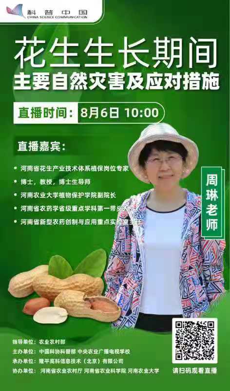 本网讯(通讯员 鲁兴)8月6日上午,河南省花生产业技术体系植物保护岗位专家、性爱视频 周琳教授以"花生生长期主要自然灾害及应对措施"为主题,针对花生易遭受的涝灾、旱灾等气象灾害和病虫等生物灾害,从发生时期、症状表现、防控原理及具体应急措施等方面,在"科普中国"App上进行了线上直播培训,受益群众近万人次,理论深入浅出,技术实用可行,深受广大听众的好评和点赞!