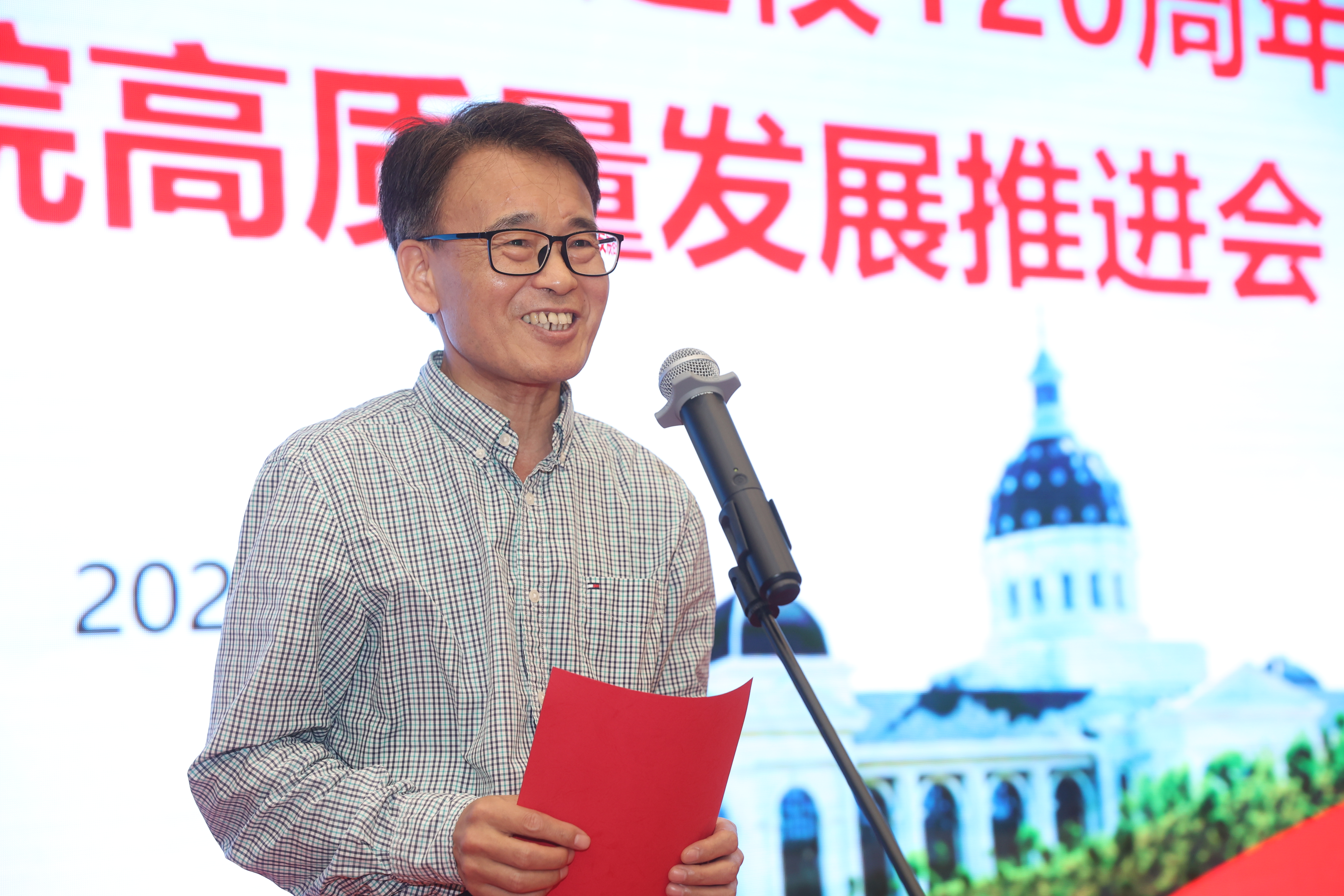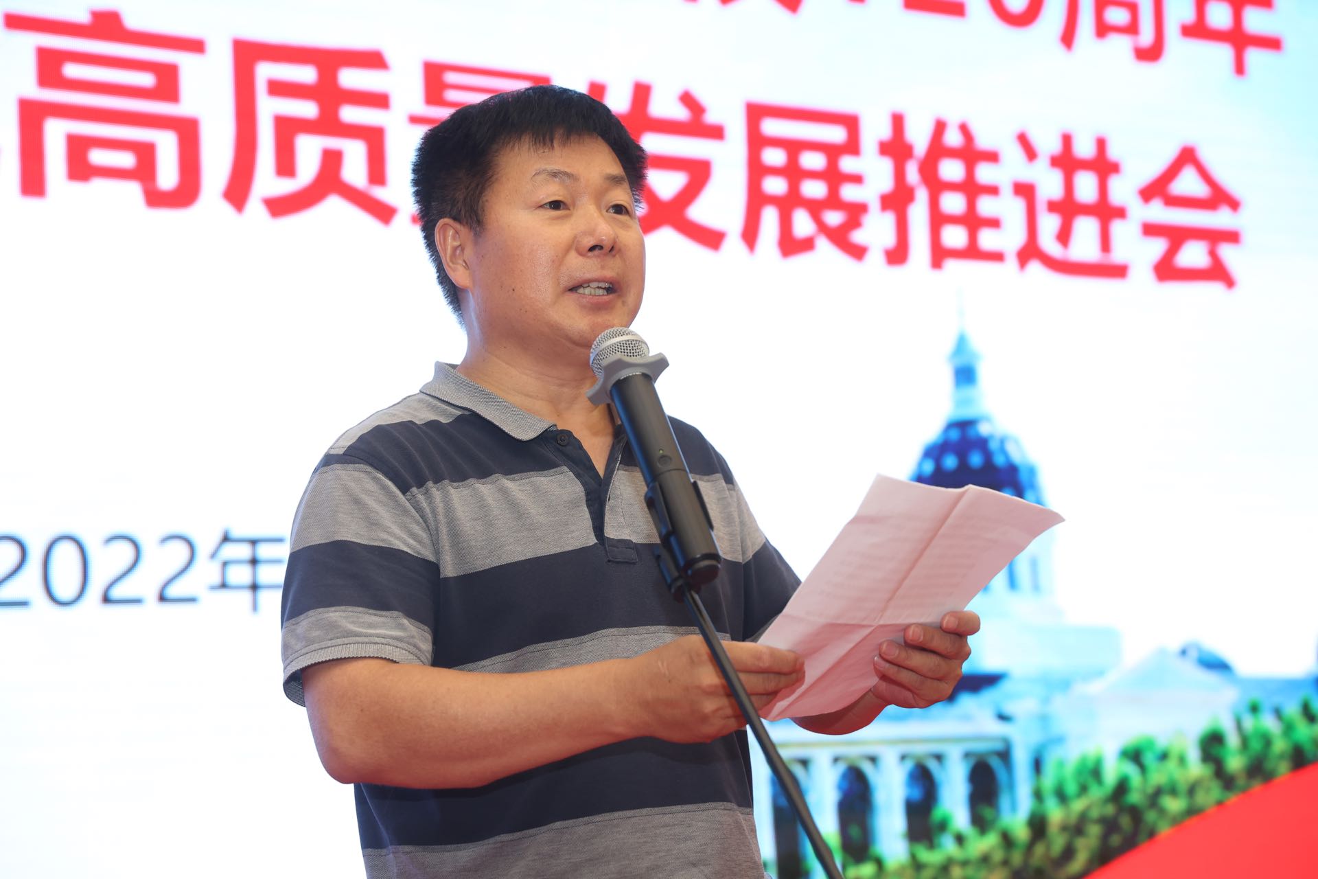 高质量发展推进会。校党委书记魏蒙关、副校长尹新明,学术副校长王道文及学校相关部门领导莅临指导,远在北京、上海及美国、英国、加拿大等国家的海内外校友纷纷发来贺信贺电,包括各级各界优秀校友代表、离退休教师代表、曾经在学院工作的领导及教工代表、学院师生代表参加了本次大会。大会由学院党委书记张留占主持。