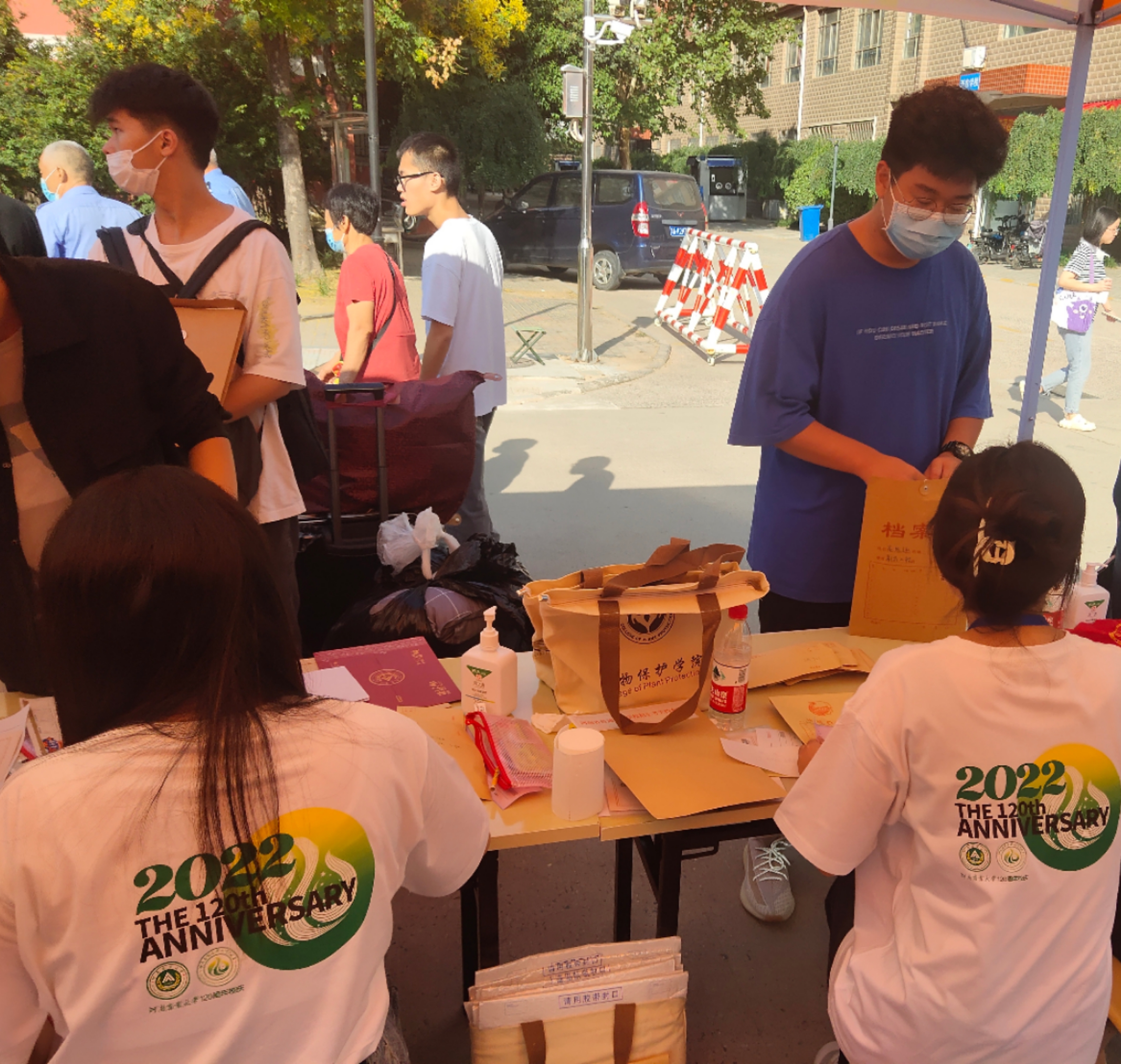 学院向每位新生发放学院定制的无纺布袋、入学指南、消毒凝胶、口罩以及太阳伞等物品。