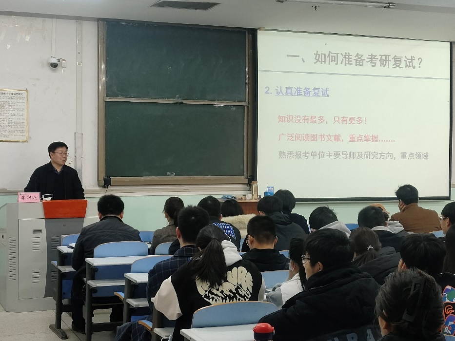李洪连以我校研究生招考为例,为大家分析了考研形势,就复试准备、复试流程、复试常见问题、面试礼仪、心态调整及考研调剂等方面为同学们做了系统讲解。他指出复试是研究生入学考试的重要环节,鼓励同学们要树立信心,端正心态,充分展示自身的专业素养,顺利通过复试。