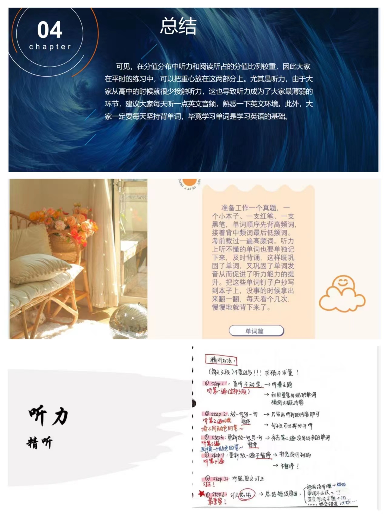语言的学习靠的是积累,词汇是基础,阅读是台阶,积累是升华。本次四六级备考经验分享会让同学们明确了备考方向,理清了复习思路,为备战英语四六级考试提供了具体有效的方法策略。预祝各位同学在未来的四六级考试中能够旗开得胜,成绩斐然,超越自我!