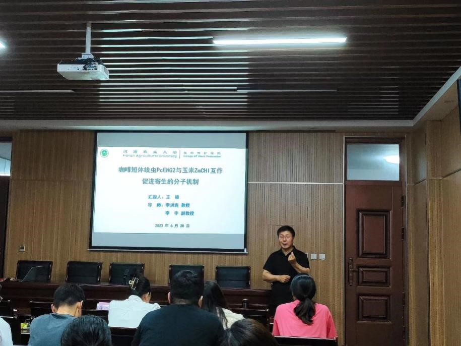 本网讯(通讯员 李凯 图片 青语大学生记者团 )6月20日下午,由党委研究生工作部主办,性爱视频 承办的“两堂两坛”学术文化之创新学术论坛在第二实验楼中217室举办。本期访谈人邀请2020级植物保护专业植物病理学博士研究生王硕,特邀嘉宾李洪连教授,学院40余名师生参加了本次学术访谈。报告会由博士研究生孙龙龙主持。