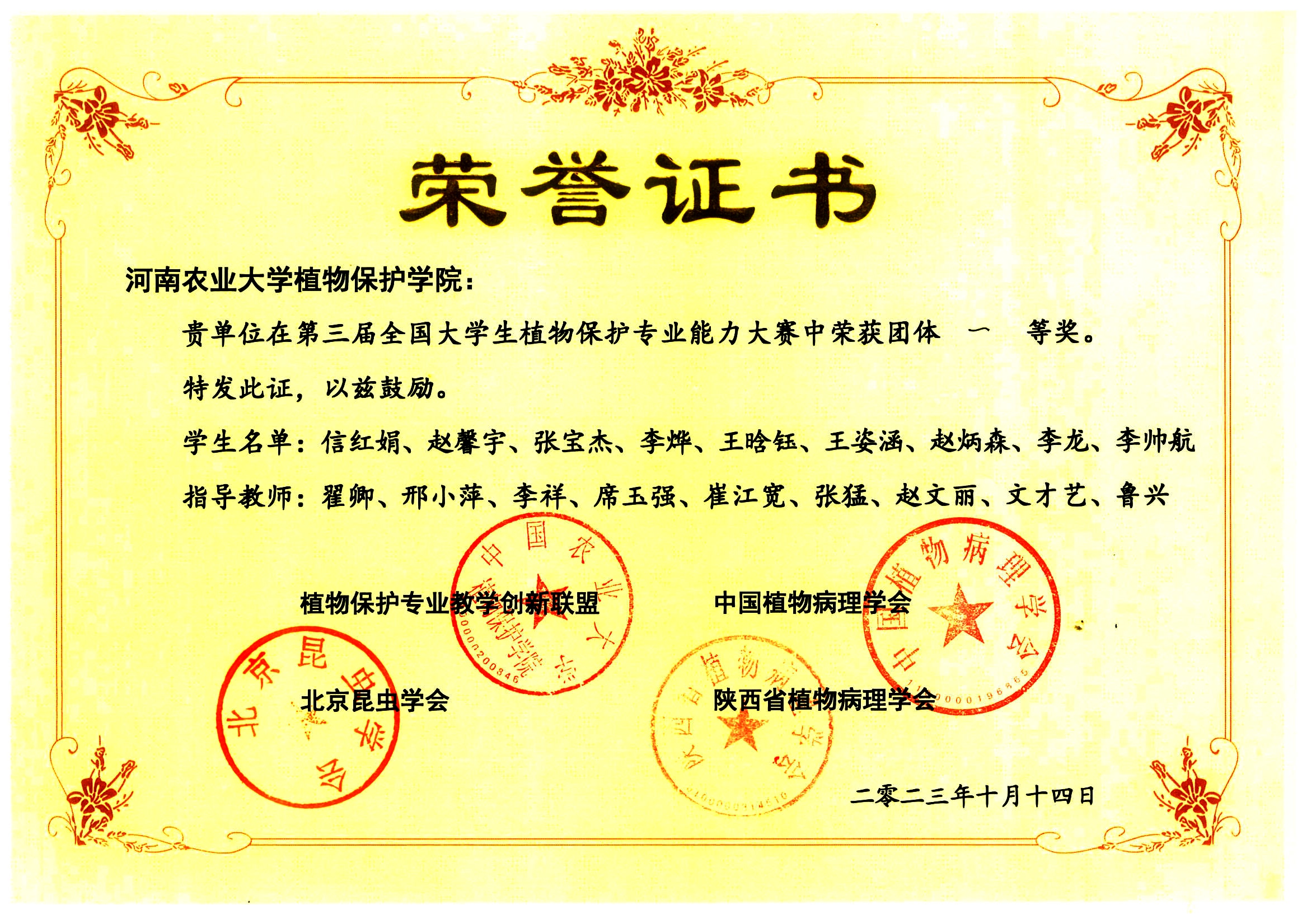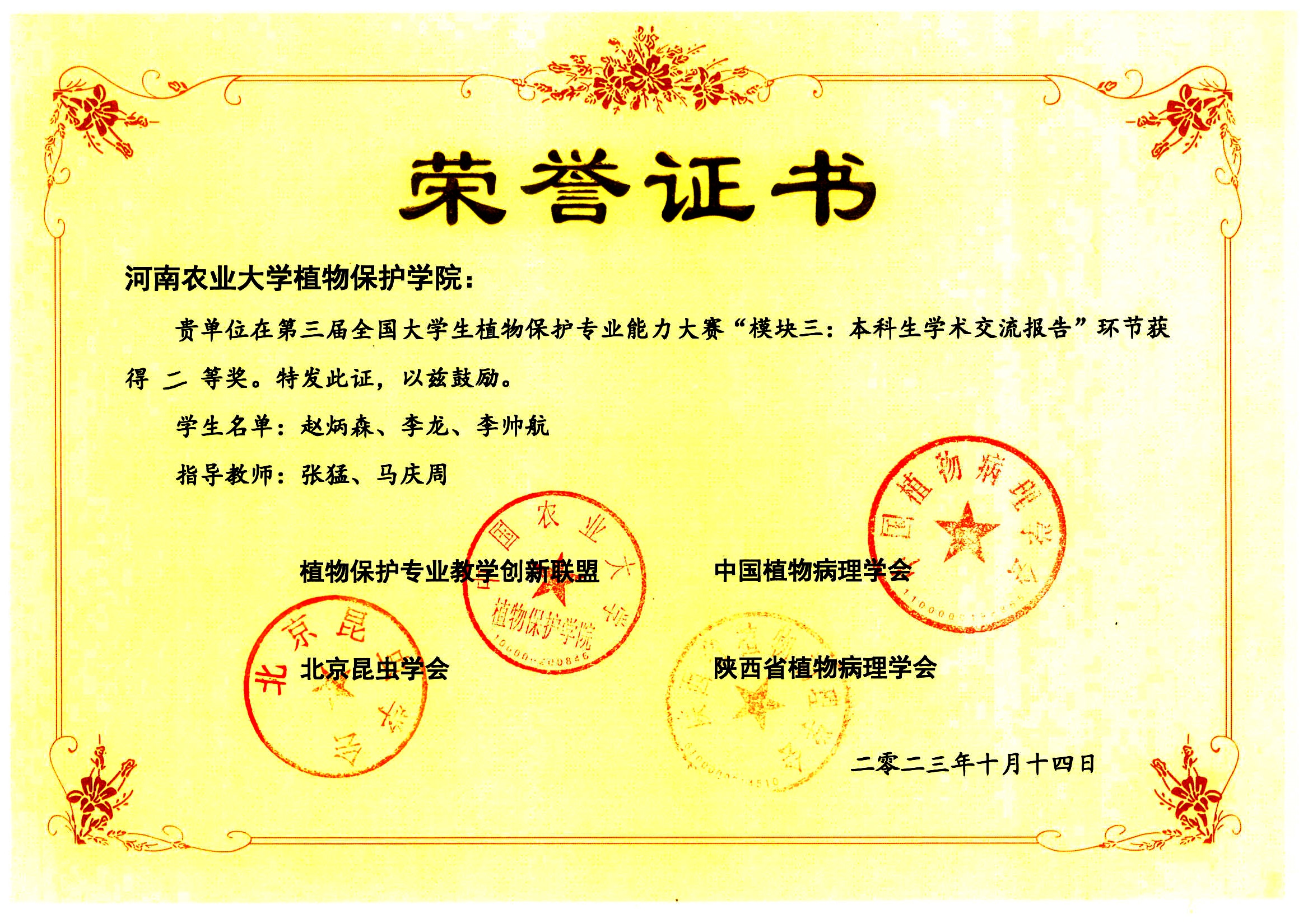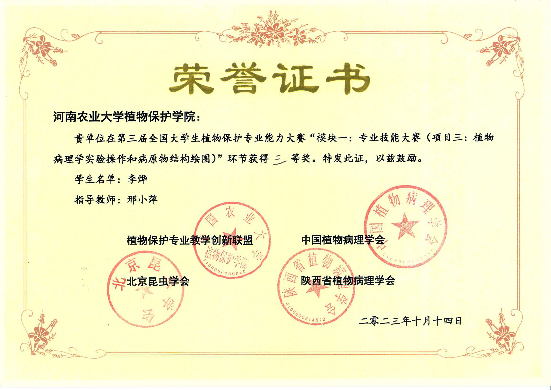 代表队荣获团体一等奖的佳绩,同时取得“本科生学术交流报告”模块二等奖和“植物病理学实验操作和病原物结构绘图”项目三等奖。