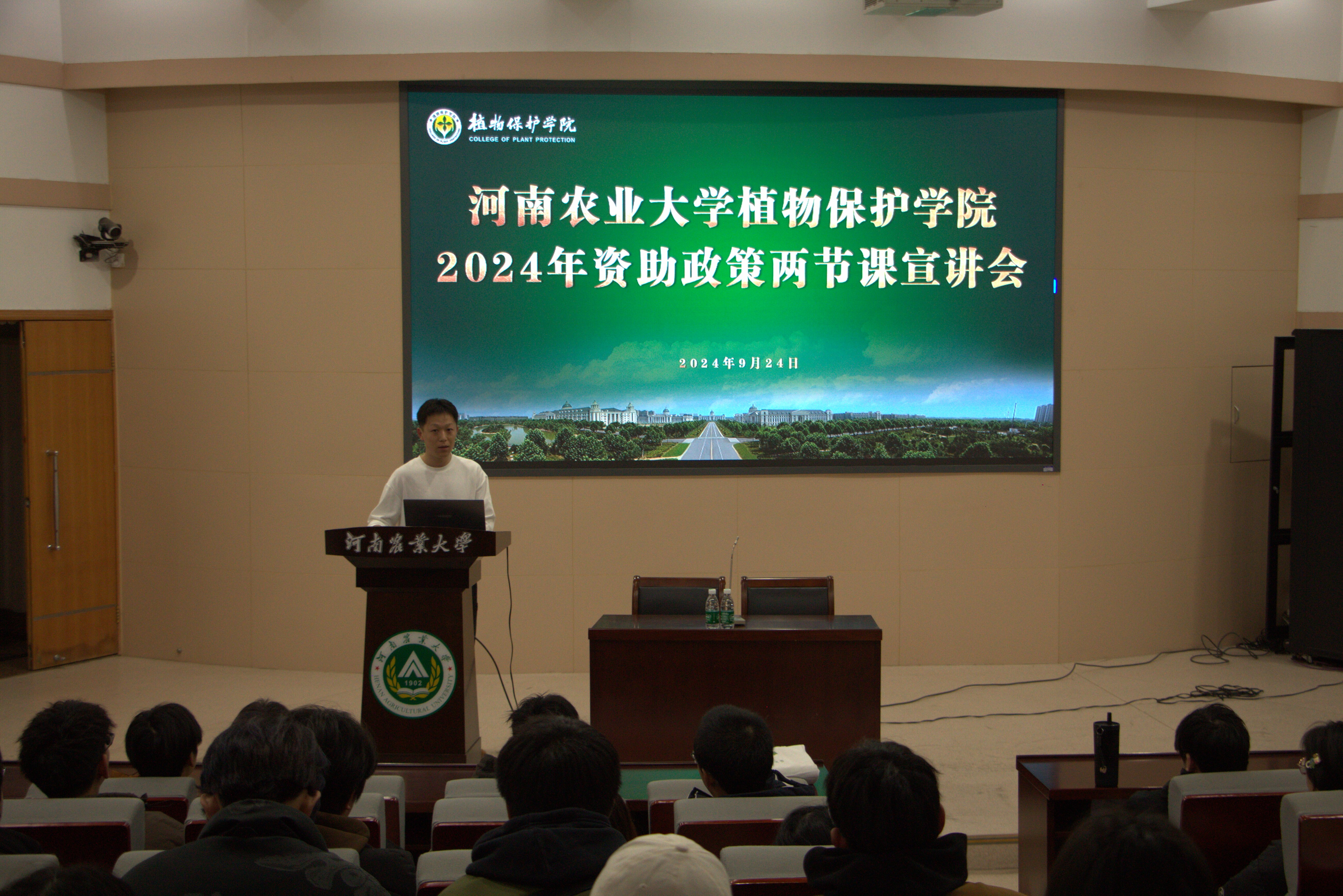 于文化路校区三百人报告厅举行2024年秋季学期资助政策“两节课”宣讲会,2024级全体学生参加会议,会议由2024级辅导员郭俊阳主持。