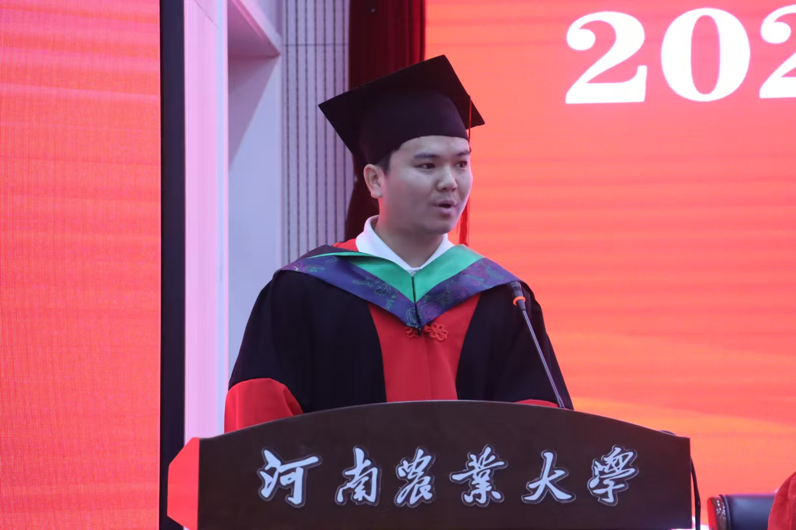 2021级博士生孙龙龙代表2025届全体毕业研究生发言,他用真挚的感情感激农大的关怀和爱护,他表示唯有保持“初生牛犊不怕虎”的锐气,鼓起“扶摇直上九万里”的劲头,终能积小胜为大胜、积跬步至干里,向母校和毕业生们表达了深深的祝福,愿学校全体教工万事顺意,意气风发,愿全体毕业生前程似锦,一路生花。
