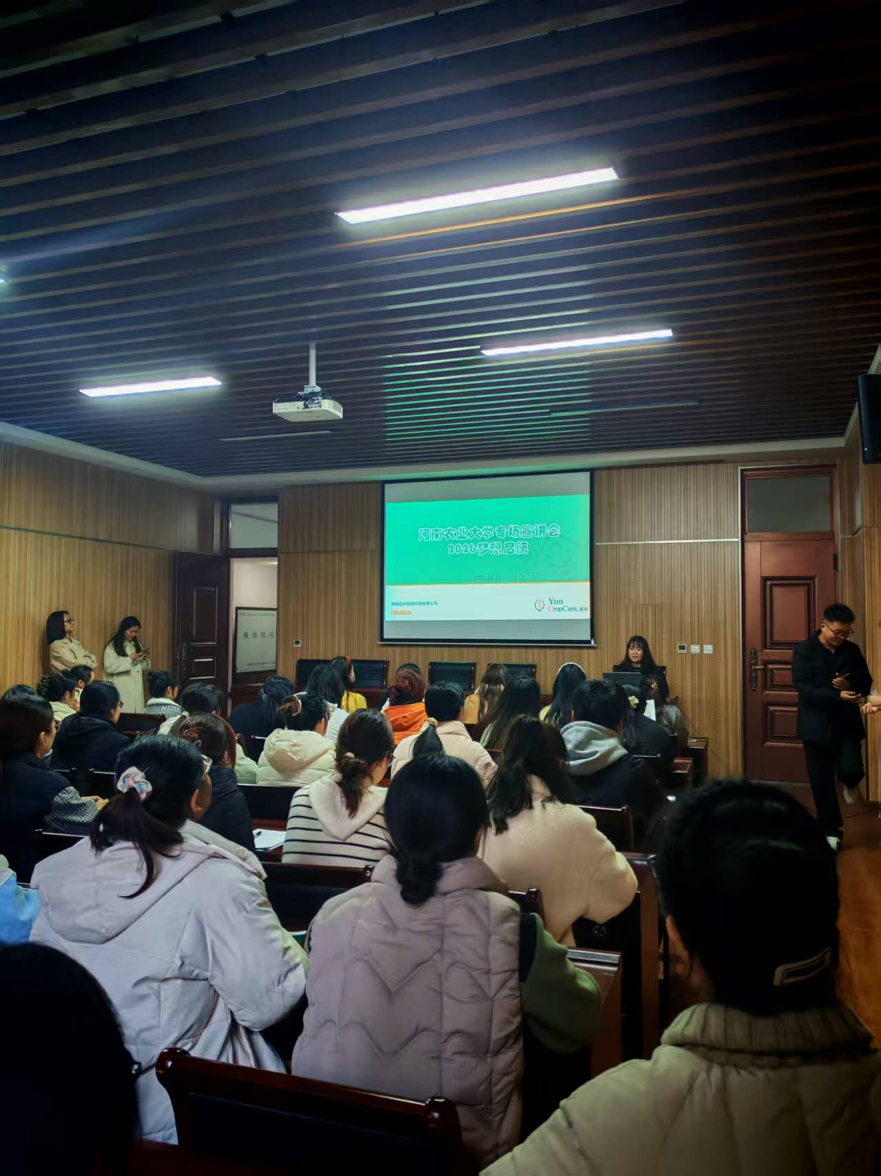 宣讲会以企业专题宣传开场,通过展示生产基地、研发实验室、田间技术服务等实景内容,直观呈现了蕴农植保的业务布局、技术实力与行业实践场景,帮助学生具象化了解植保行业的产业生态。随后,企业负责人系统介绍了公司发展历程:自农药制剂代工业务起步,逐步发展为集研发、生产、国际贸易于一体的高新技术企业,目前年营收超亿元,产品市场覆盖国内外多地区;同时重点解读了企业在生物防治、智慧植保装备等领域的核心技术成果,为学生厘清了行业前沿方向。