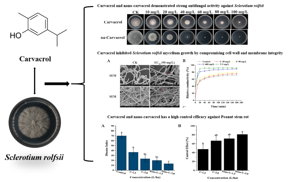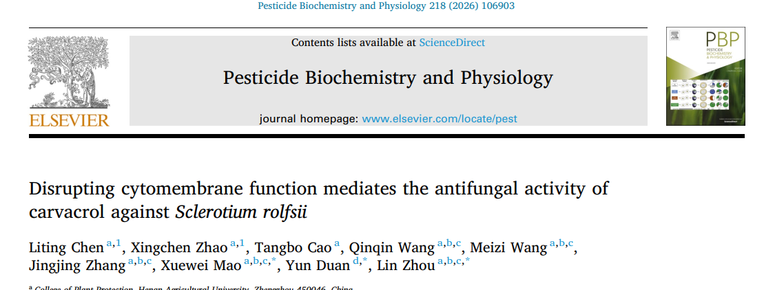 周琳教授团队在中科院一区Top期刊《Pesticide Biochemistry and Physiology》上发表题为“Disrupting cytomembrane function mediates the antifungal activity of carvacrol against Sclerotium rolfsii”的研究成果。研究证实天然化合物香芹酚及其纳米制剂对花生白绢病菌齐整小核菌具有强烈抑制作用,为农业生产中花生白绢病的绿色、高效防控提供了全新思路与解决方案,有望推动生态友好型杀菌剂的研发与应用。